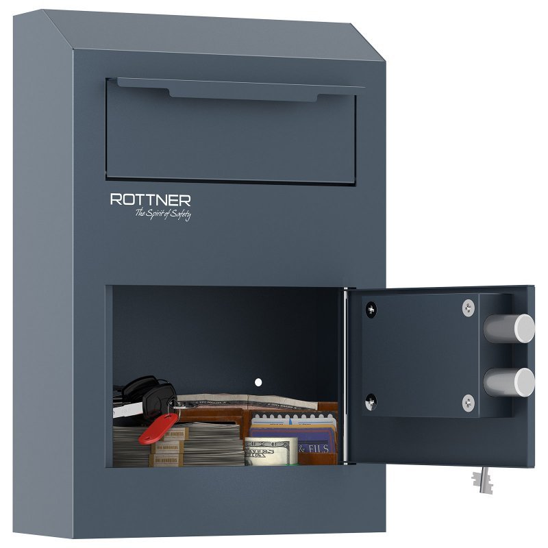 Hlavní výhody: Standardní trezorový zámek s 2 klíči Vhazovací mechanizmus Úhel otevření dveří do 90 ° Otvory na ukotvení ve spodní i zadní straně sejfu Sejf, který kombinuje výhody klasické poštovní schránky a vlastnosti sejfu. Vhazovací mechanismus v horní části sejfu zajistí potřebnou ochranu již vhozených věcí. Následně je možné vhozené věci vybrat otevřením spodních dveří sejfu, které jsou chráněny klíčovým zámkem. Skvělý varianta pro každého, kdo hledá kompromis mezi vlastnostmi poštovní schránky a sejfem. Sejf můžete připevnit díky připraveným otvorům na spodní i zadní straně. Kotvící materiál je součástí balení.